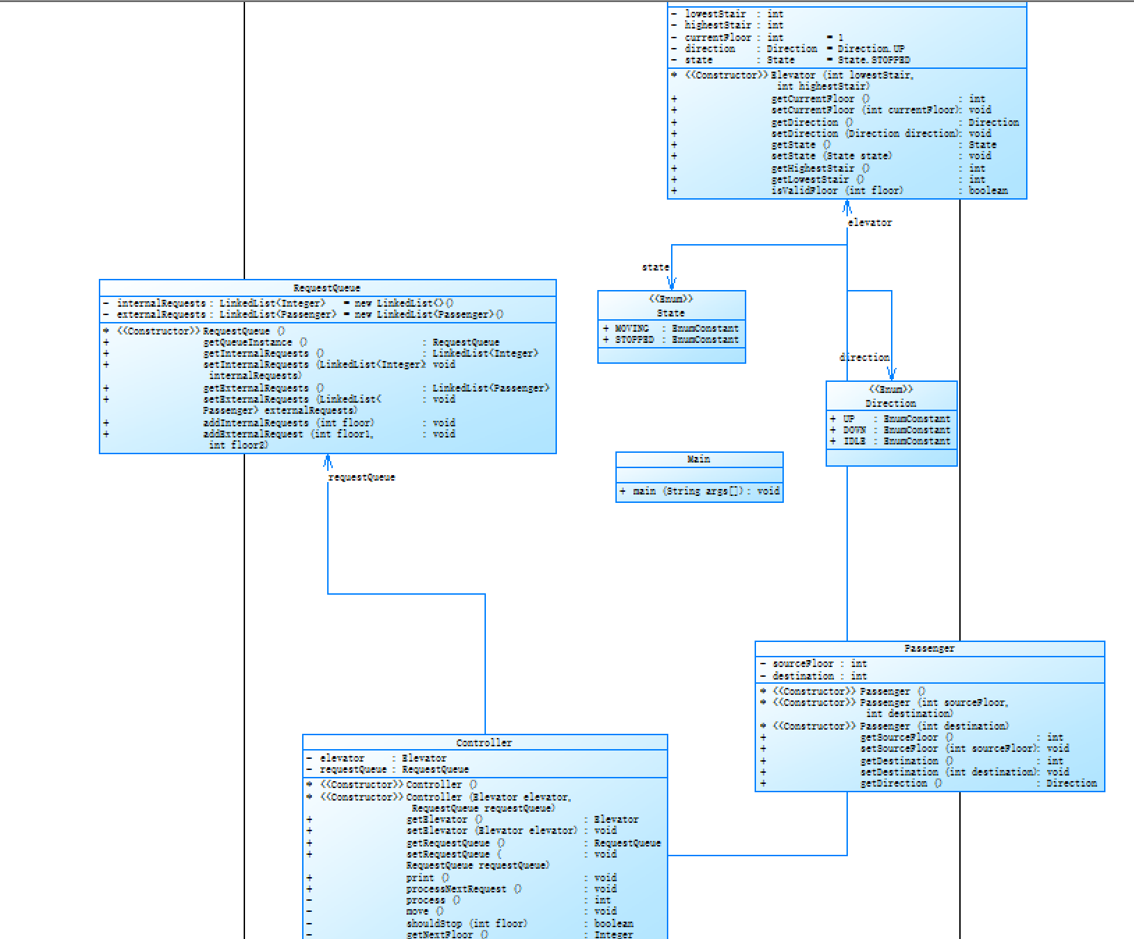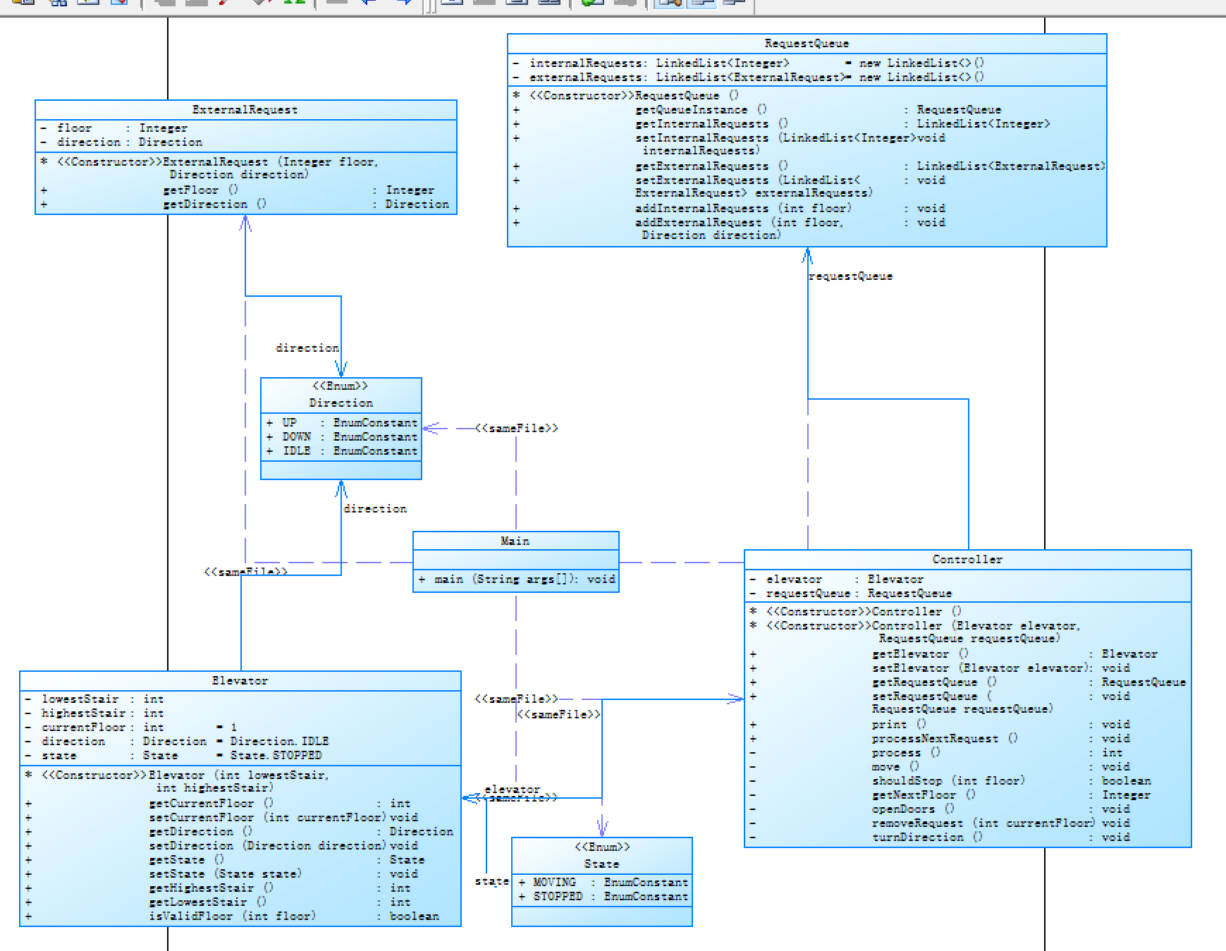 第一次电梯调试要求我们只用一个电梯类,所以主要解决的就是算法问题以及需求分析,而其主要涉及略微修改的Look算法[1](方向优先,即优先处理同方向的需求),此外我还学会了如何使用正则表达式(这真的是用来处理String的一大利器啊😄,这是在C语言处理字符串时没有体验过方便与爽快);