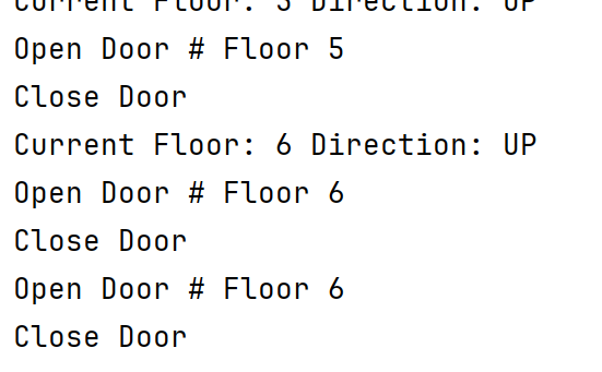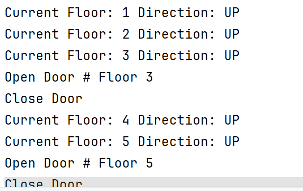 System.out.printf("Current Floor: %d Direction: %s\nOpen Door # Floor %d\nClose Door", this.currentStair,