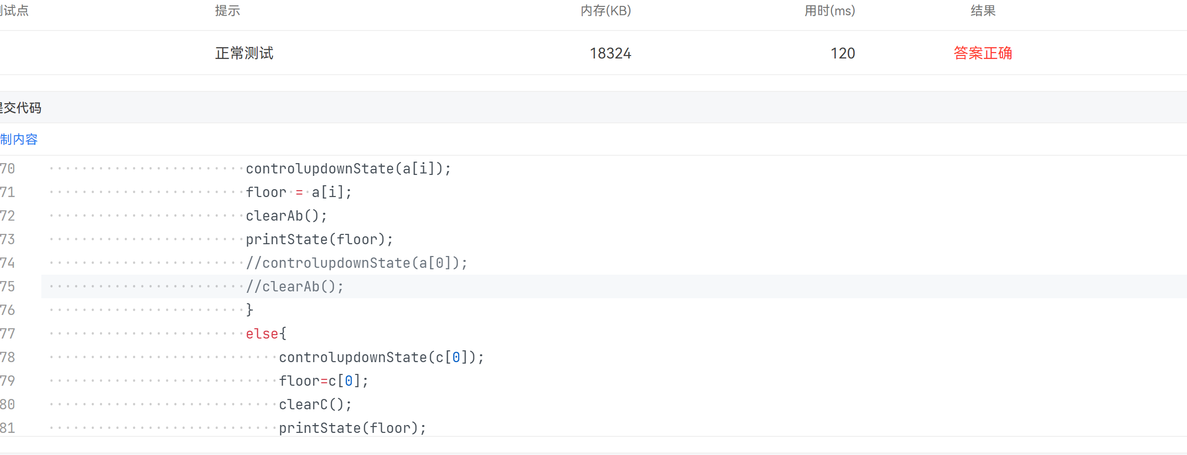1.在第一次代码编写完成后,测试样例是通过了,但结果是答案错误,由此可见此时我的算法还是存在一些问题的,但我找了许久没发现错处。直到上课时老师随便提了一下,提供了一个新的测试用例,我根据这个测试用例找到了错误点,那就是电梯开始运行时我只考虑了距离而没考虑外部请求与运行方向不同方向的情况。具体如下图: