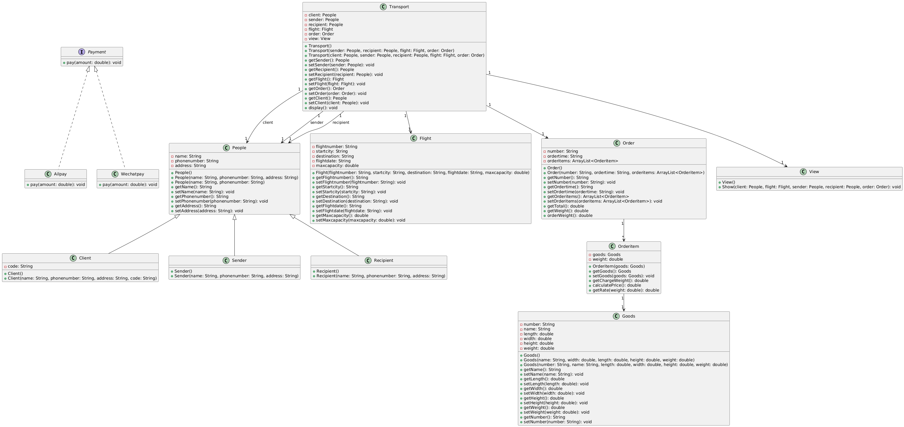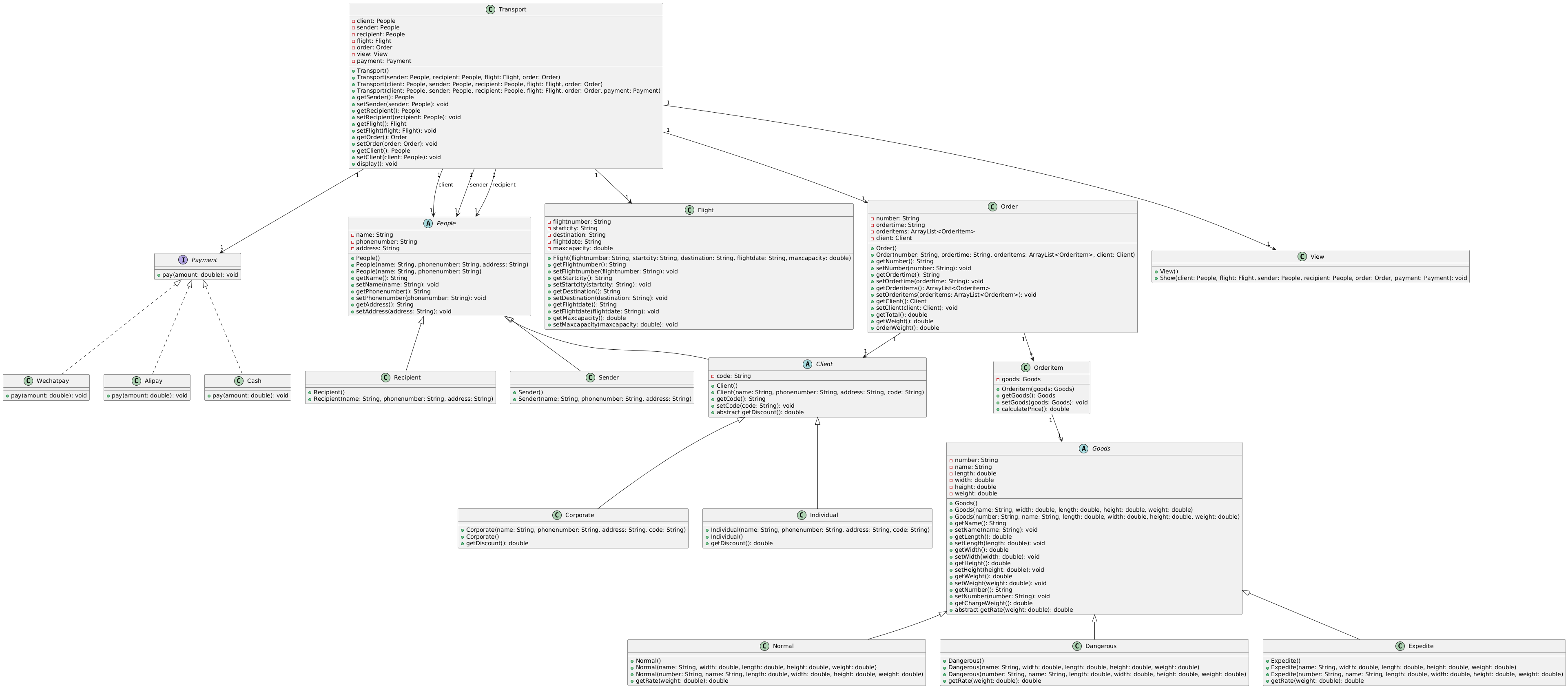 这第二次就是在第一次的基础上扩展了几个新类,运用到的就是Java中继承与多态两大特性。在第一次时类设计就比较合理,所以扩展起来还是比较简单的,但我在上面说到后面会有一个坑,这个坑就是,如果我们将计算计费重量的方法以及获取重量单价的方法放在订单项类中的话,现在在原有的基础上增加了危险品与加急品两种货物类型,并且它们的单价有所不同,难道我们要在订单项类下扩展出几个货物类型的子类吗?这显然是不合理的,所以用于计算计费重量的方法与获取单价的方法放在货物类中更为合理,而计算一个货物价格的运费放在订单项类中更为合理。