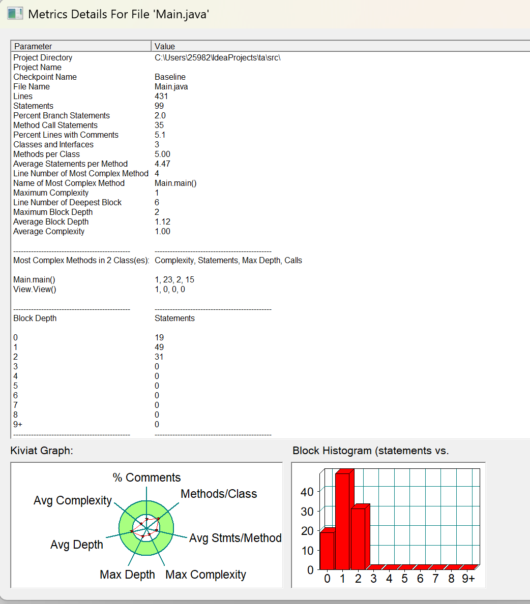 Most Complex Methods in 2 Class(es) :列出了最复杂的方法及其复杂度、语句数、最大深度、调用数。Main.main() 方法复杂度为 1,语句数 2 条,最大深度 2 ,调用数 15 次;-View.View() 方法复杂度为 1,语句数 0 条,最大深度 0 ,调用数 0 次。