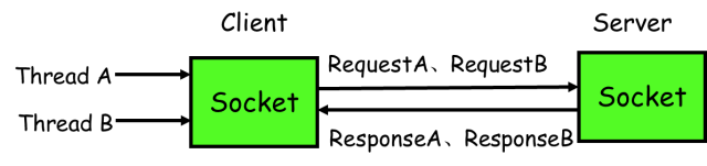 如下图所示,线程A和线程B同时向client socket发送请求requestA和requestB,socket先后将requestB和requestA发送至server,而server可能将responseA先返回,尽管requestA请求到达时间更晚。我们需要一种机制保证responseA丢给ThreadA,responseB丢给ThreadB。