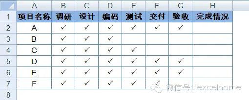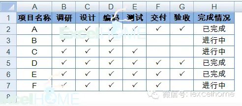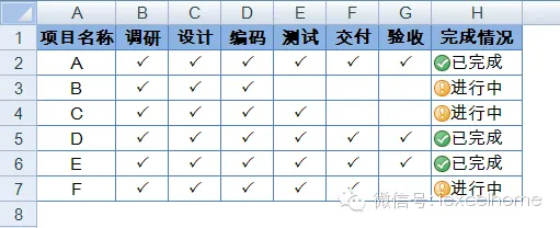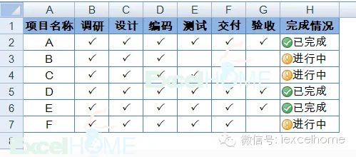 工作中有一些项目进程跟踪表格通常如下图所示,在“完成情况”一列中会通过文字来标识项目完成情况。