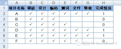 最外围的N函数用于将上述的True或False的逻辑判断结果转换为数值1或0,True对应结果为1,False对应结果为0。由此H列的结果就是由数值0或1来表示项目是否已完成,如下图所示。