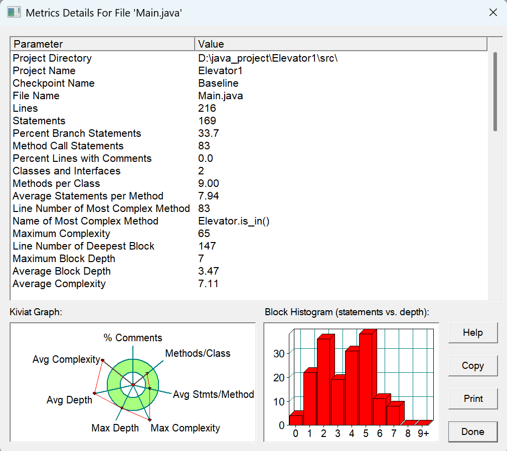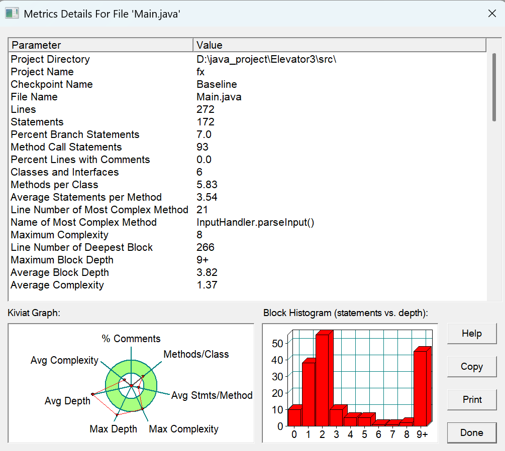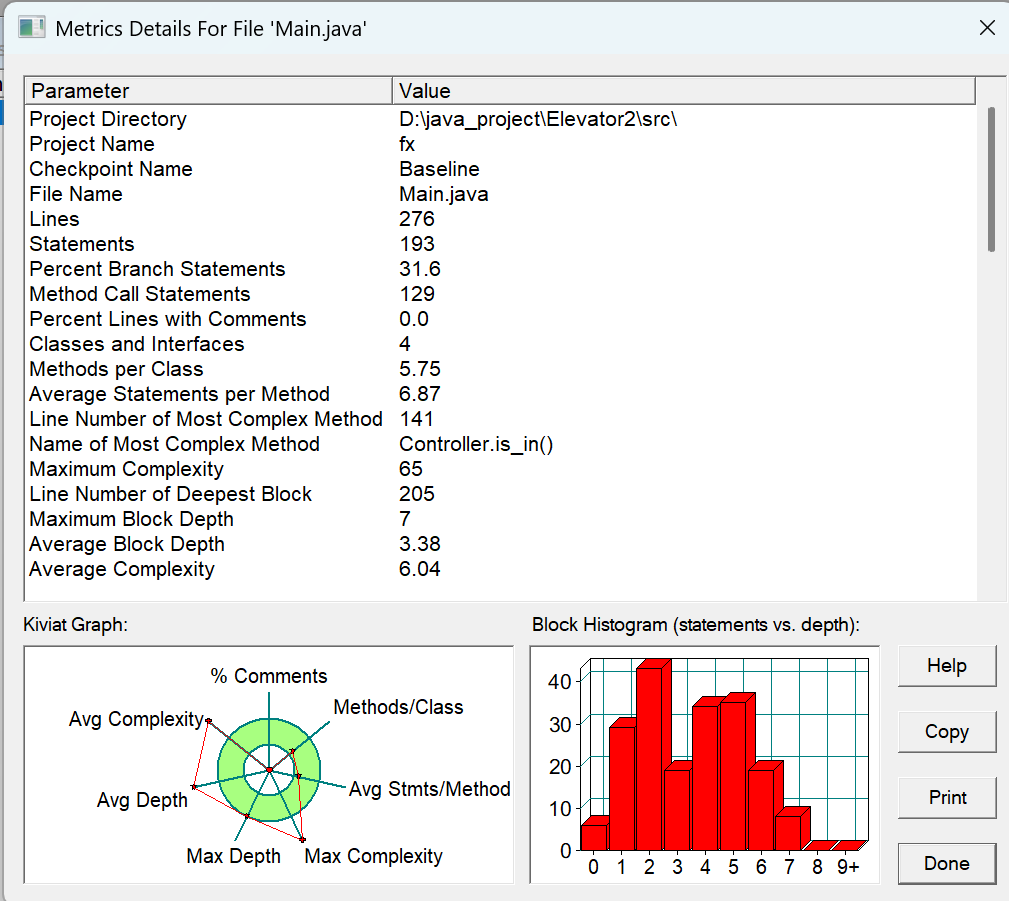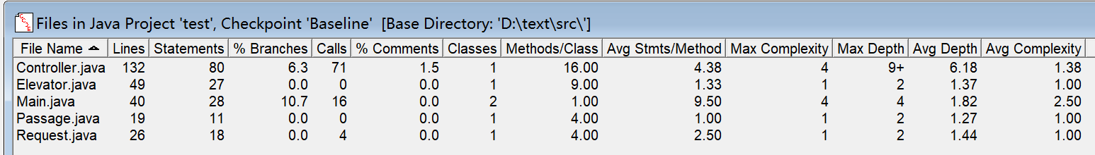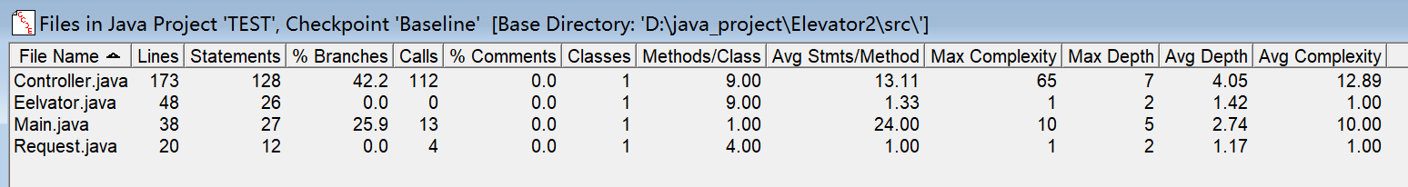 最大复杂度:65,这是一个极高的值,表明存在一个方法(Elevator.is_in())的逻辑极其复杂,这主要是因为第一次写如此大规模的Java代码,还不了解面向对象的真正要求,仍然使用C语言面向过程的思维,我会慢慢地将我的思维转换过来。