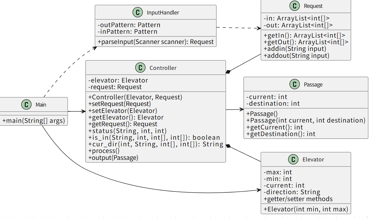 对之前电梯调度程序再次进行迭代性设计,加入乘客类(Passenger),取消乘客请求类,类设计要求遵循单一职责原则(SRP),要求必须包含但不限于设计电梯类、乘客类、队列类以及控制类,具体设计可参考如下类图。