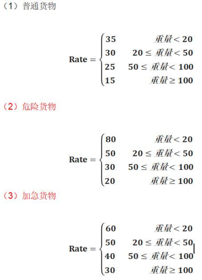 本次作业费率与货物类型有关,货物类型分为普通货物、危险货物和加急货物三种,其费率分别为: