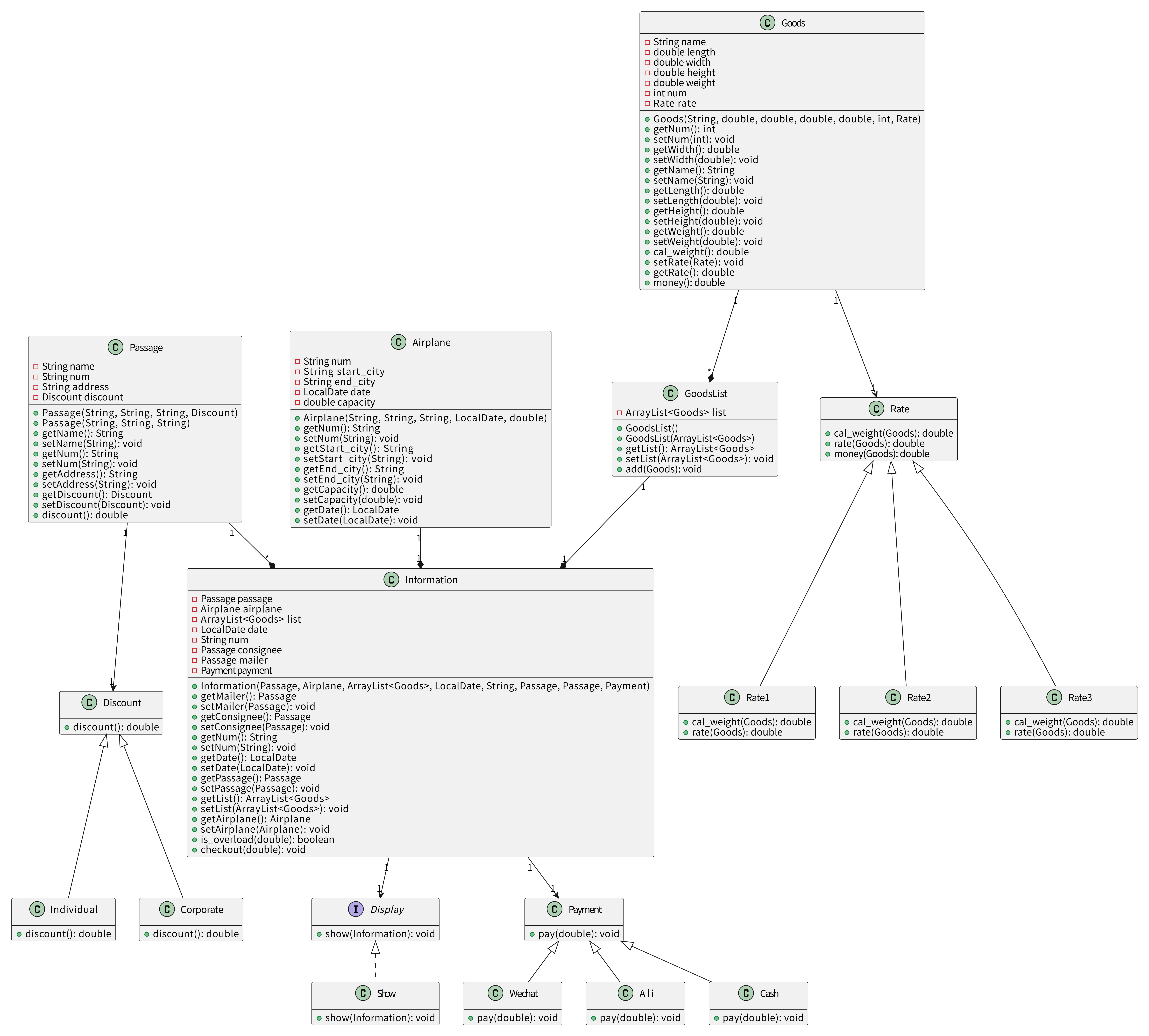 我认为用户、支付方式、货物的扩展应该使用接口更加的合适,这样才更加符合合成复用原则,但由于题目要求我任使用了继承,可能是因为当前在学习继承,老是想让我们实操,从而更加掌握继承。后来我也将继承改成了接口,具体类图如下: