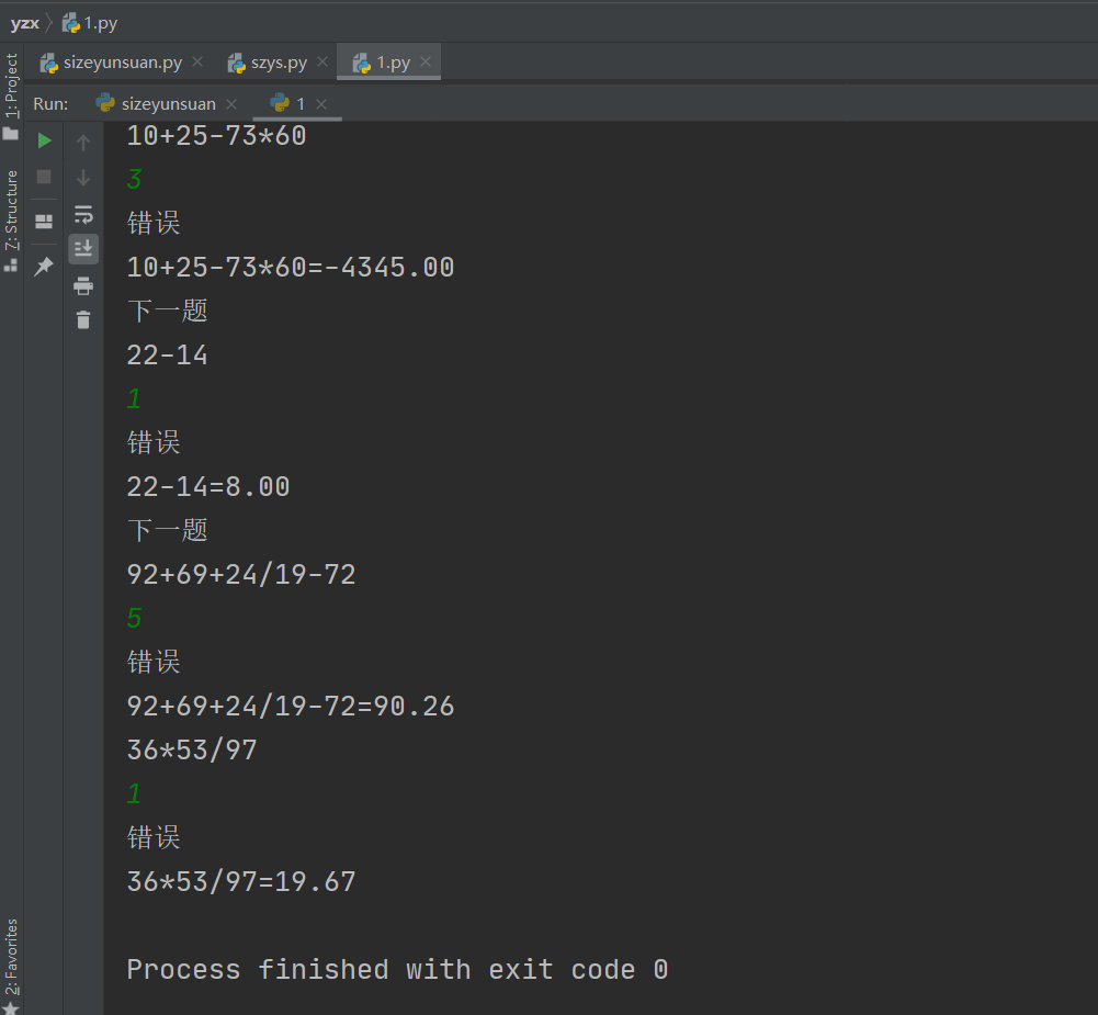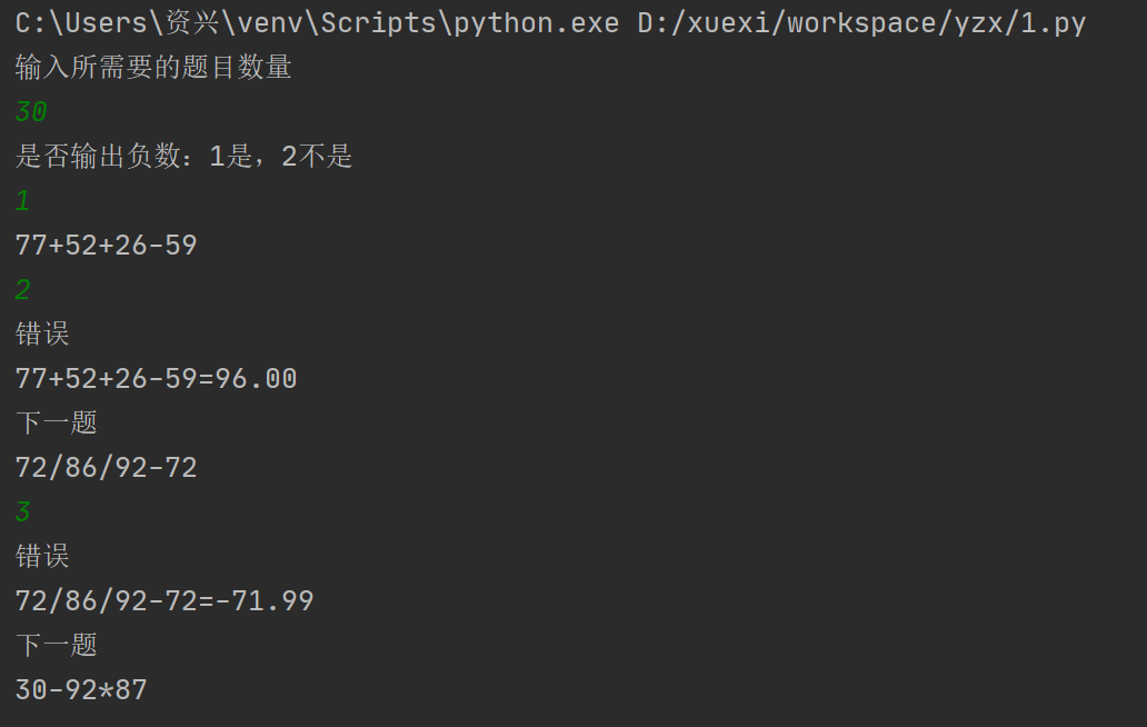 import random import numpy as np print('输入所需要的题目数量') #这里设置要多少个算式 n = int(input()) j=0 print('是否输出负数:1是,2不是') #这里设置是否要输出负数 f=input() f1=int(f) while j<=n: fhgs = np.random.randint(4, size=4) #生成随机数组,作为运算符的下标,实现随机产生运算符 shu = np.random.randint(1, high=100, size=5) #生成随机数组,作为运算数 zfs = random.randint(1,4) #生成随机数,实现输出不同个数运算符的算式 ysf = ['+', '-', '*', '/'] #定义号 四个运算符 if zfs ==1: #按照随机数,实现输出不同个数运算符的算式 str1 = str(shu[0]) + ysf[fhgs[0]] + str(shu[1]) elif zfs ==2: str1 = str(shu[0]) + ysf[fhgs[0]] + str(shu[1]) + ysf[fhgs[1]] + str(shu[2]) elif zfs ==3: str1 = str(shu[0]) + ysf[fhgs[0]] + str(shu[1]) + ysf[fhgs[1]] + str(shu[2])+ ysf[fhgs[2]] + str(shu[3]) elif zfs ==4: str1 = str(shu[0]) + ysf[fhgs[0]] + str(shu[1]) + ysf[fhgs[1]] + str(shu[2])+ ysf[fhgs[2]] + str(shu[3])+ ysf[fhgs[3]] + str(shu[4]) result =eval(str1) #计算结果 if f1==2: #正数输出 if result in range (0,100): #确保结果范围 j=j+1 #计数,实现指定输出多少个算式 print(str1) x=input() y=int(x) if y==result: #验证计算的答案是否正确 print('正确') print('下一题') else: print('错误') #输出正确答案 print(str1 + '=' + "%.2f" % result + ' ') print('下一题') elif f1==1: #负数输出 if result <=100: j = j + 1 print(str1) x = input() y = int(x) if y == result: print('正确') else: print('错误') print(str1 + '=' + "%.2f" % result + ' ') if j<n: print('下一题')