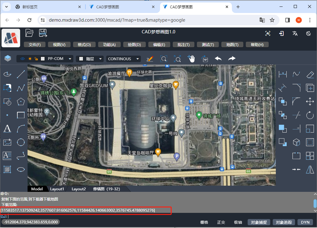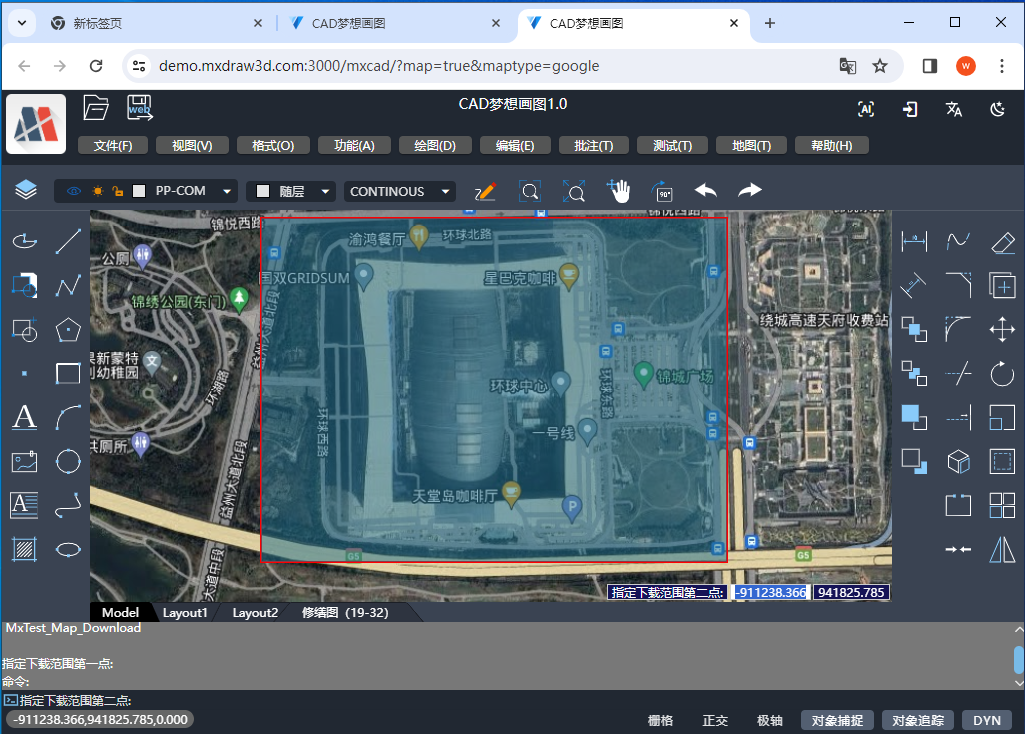 1. 谷歌浏览器打开网页地图:https://demo.mxdraw3d.com:3000/mxcad/?map=true&maptype=google,打开后依次点击工具栏的地图、地图下载按钮,如下图所示: