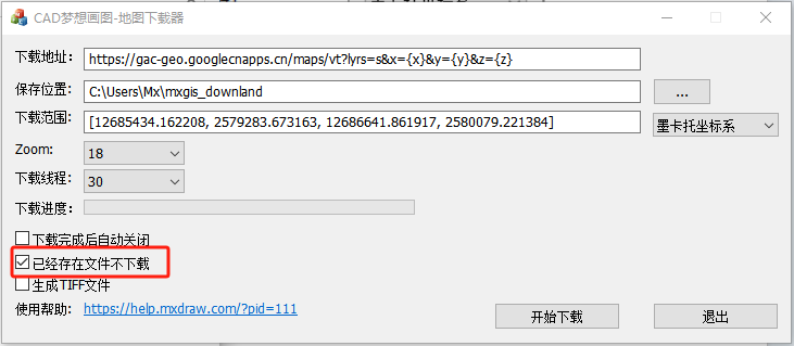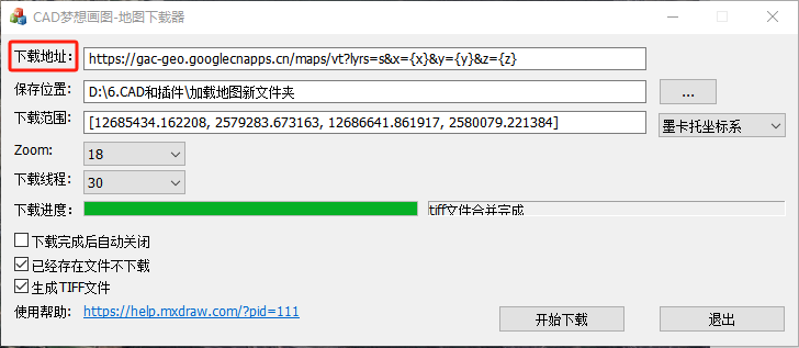 5. 粘贴好之后,点击开始下载即可,下载的地图需要生成TIFF文件的,需要勾选左下角选框,生成好的文件会在保存到相关位置,效果如下: