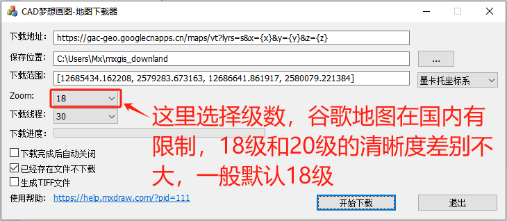 该选项里面有0-21级,级数越高,代表地图放大的越清晰,图纸内存也就越大,一般我们默认18级。