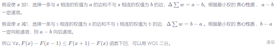 等等,我的凸性呢?其实是有的,考虑在上面的定义下真正的最小生成树的权值和怎么算,其实就是加上了 \(r_x\times x\)。当 \(x\) 单增时 \(r_x\) 单调不增,这就形成了一个凸包啊。
