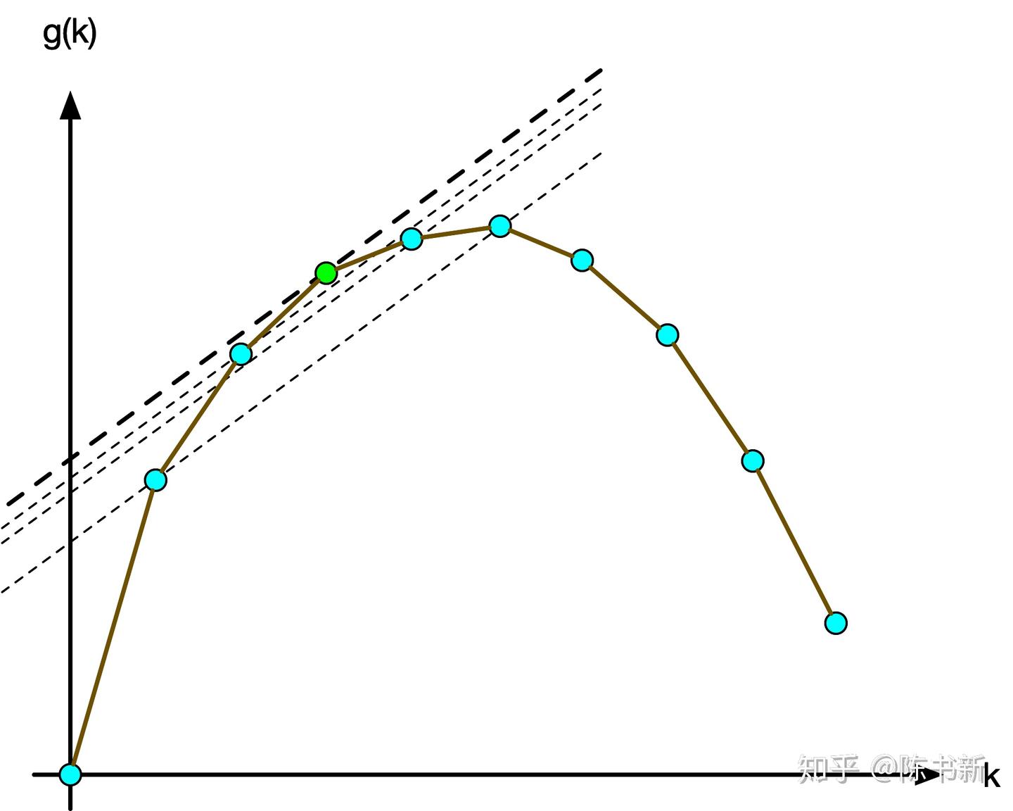 至于凸包上包含 \((k,F(k))\) 的相邻的几个点斜率相等的情况,此时截距相同,这可以看作是多选择一个物品,但是价值为零。因此只需要每次求出最大的 \(k_{max}\),并判断它与我们所需求的 \(k\) 的大小关系。