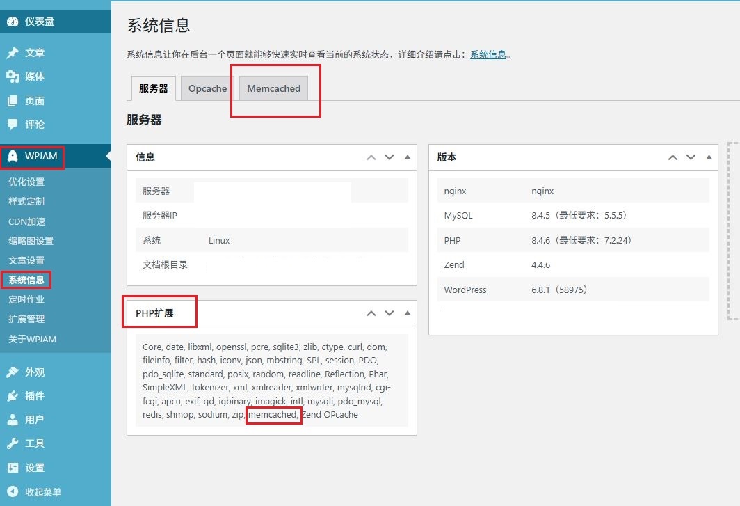 在没有配置object-cache.php的文件时,这里的选项卡Memcached不存在,我们下一步就开始配置文件。