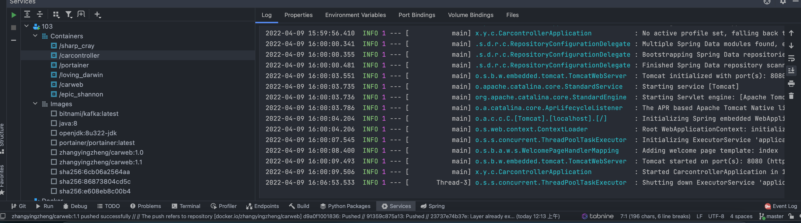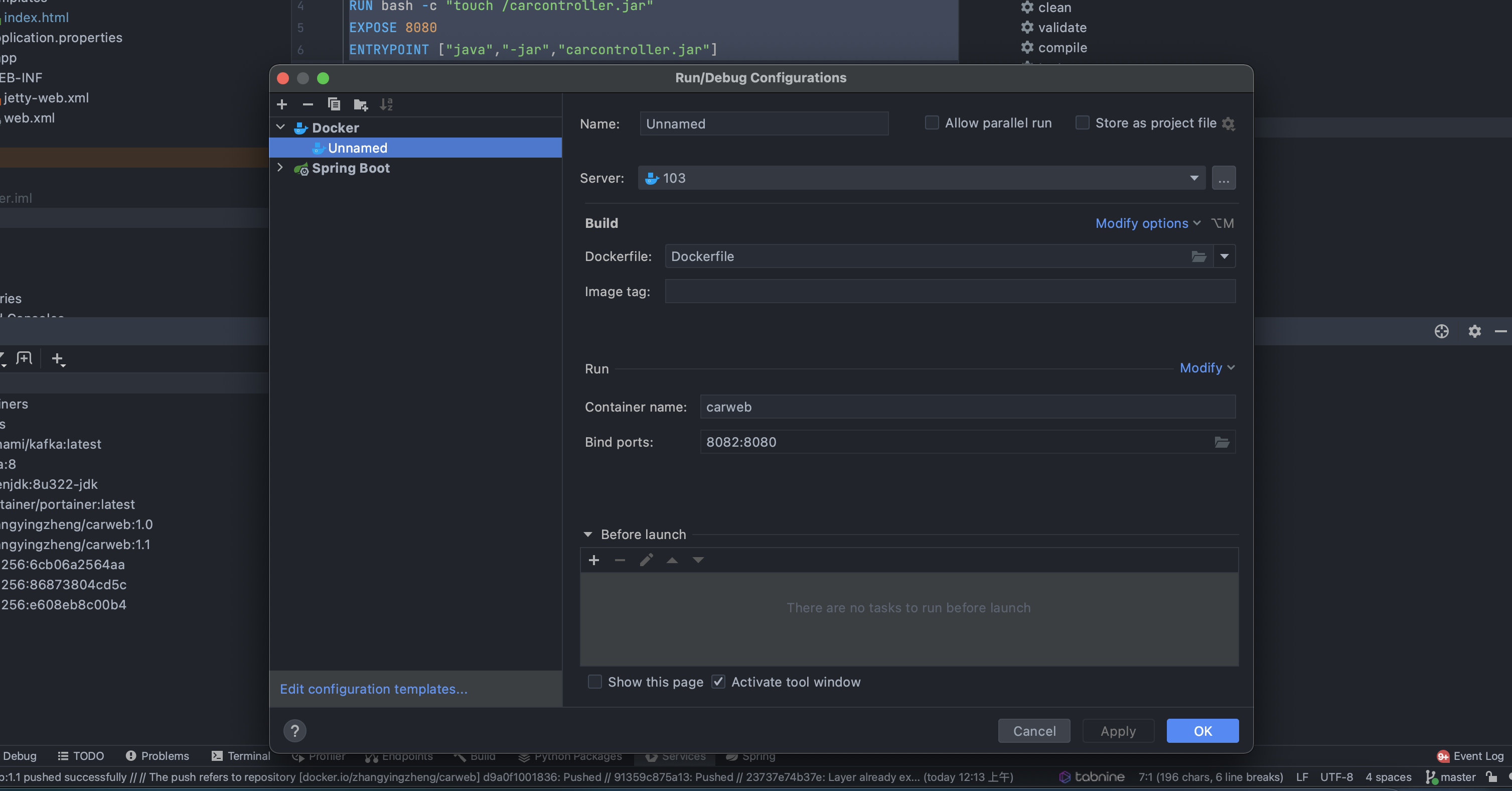 docker login zhangyingzheng docker pull zhangyingzheng/carweb:1.1 docker run -itd --name carweb1.1 -p 8080:8080 zhangyingzheng/carweb:1.1