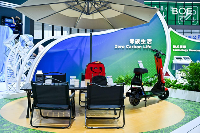园区是BOE(京东方)积极推进“双碳”目标的重要方向,基于多年在多个零碳工厂的应用经验,在零碳园区中展出的“近零碳园区”作为“绿色智慧科技创新示范园”,搭载了能源智慧管控平台,可实现源网荷储多种协同,节能率达52%,该项目以可复制、可运营、可推广等优势,获得“能源互联网最佳实践案例”、“领军项目奖”等多个奖项。进入零碳生活展区,BOE(京东方)首发的钙钛矿光伏手机背板吸引众多目光,这是行业首次将钙钛光伏电池应用在移动终端领域,能够实现最高2W的充电功率,在绿色低碳的同时有效缓解续航压力,也为移动终端产业的迭代升级创造了新的应用场景。同时,BOE(京东方)还展出了钙钛矿光伏遮阳伞、钙钛矿光伏电动车等产品,极大拓展了钙钛矿的应用场景。