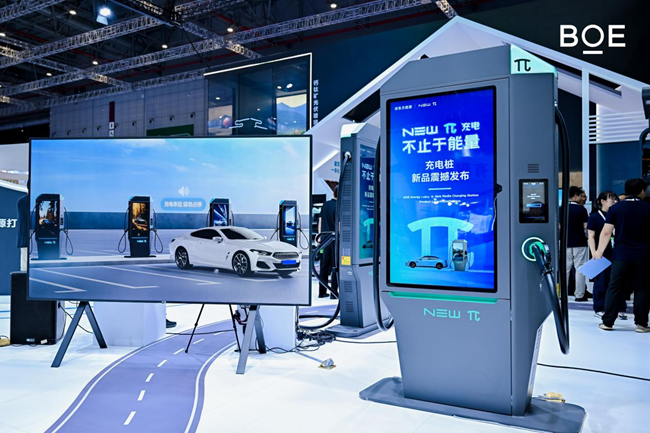 展会同期,BOE(京东方)还成功举办了一系列重要活动,邀请众多来自产业链上下游及重要合作机构的领导嘉宾出席。在New π 新派充多媒体充电桩发布仪式上,相关嘉宾共同见证了这一创新成果的亮相。本次发布新品以“能源+媒体”双核驱动为核心理念,设计集聚商业模式创新和能量无穷无尽的概念,采用分体式柔性充电方案,最大输出功率高达250KW,配备正反面各1块55英寸屏幕及1块10.1英寸触摸屏,巧妙融合充电场景与户外数字广告场景,以“New”所代表的“新技术、新体验、新模式”有效拓展绿色能源服务生态,助力城市智慧能源网络建设。