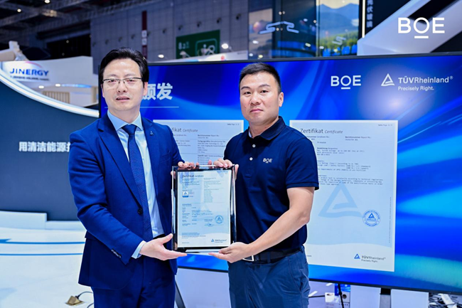 与此同时,BOE(京东方)在展会上还隆重举行了“钙钛矿光伏组件IEC认证证书颁发仪式”,德国莱茵TÜV集团全球电力电子产品服务副总裁兼大中华区太阳能与商业产品服务副总裁李卫春为BOE(京东方)颁发了IEC 61215/61730认证证书,标志着BOE(京东方)在钙钛矿光伏组件的可靠性达到行业头部水平,也是对BOE(京东方)在该领域技术产品水平的高度认可。