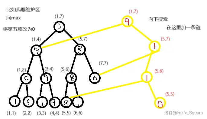 由线段树得到启发,每次修改时只会经过约 \(\mathrm{log_2} \ N\) 个节点,所以每次只需要动态开点增加一条链,改变的区间(儿子)开点,不改变的区间不变,对应到原版本位置上,记录新根节点编号即可。这样空间复杂度就是 \(O(2n-1+m \ \mathrm{log} \ n) = O(2n+m \ \mathrm{log} \ n)\),实际开个 tree[MAXN<<5] 一般也不会爆。
