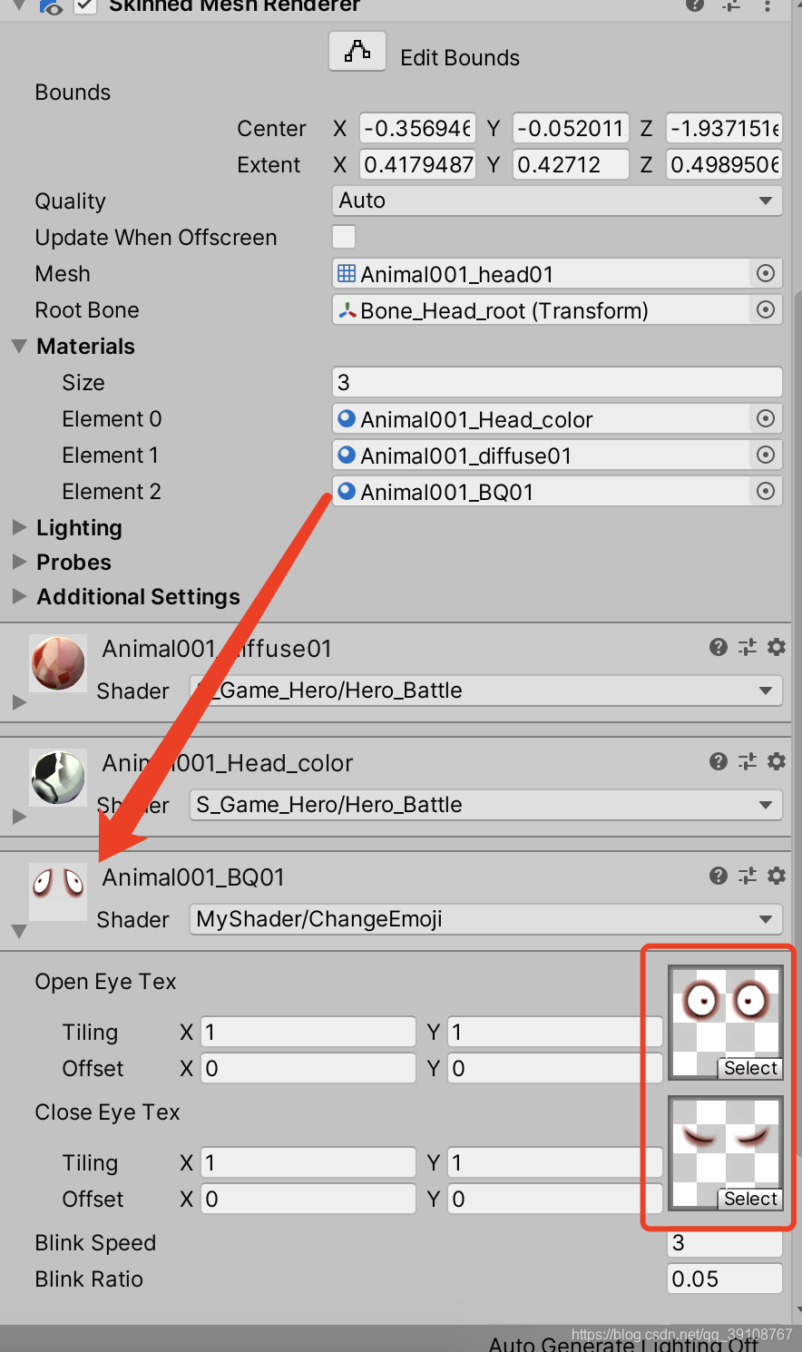 眼睛部分单独作为一个材质球,准备一张睁眼一张闭眼的贴图,在shader中自动切换贴图,实现眨眼效果