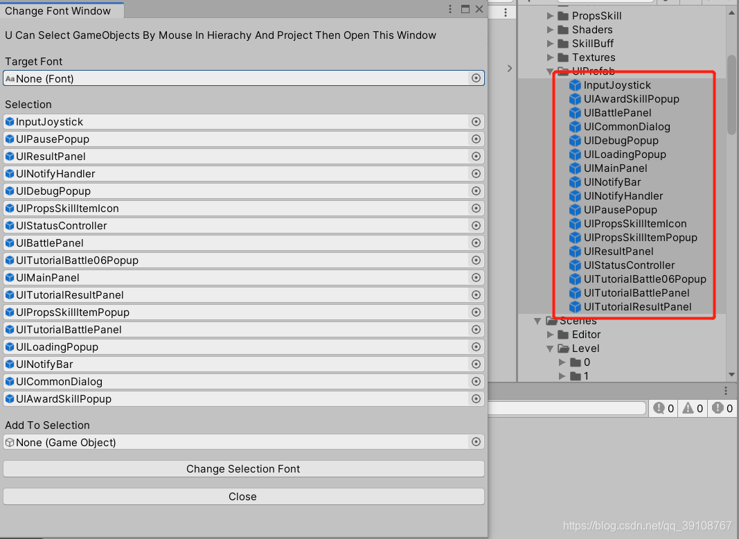 在面板中选中需要修改Text组件的预设体,打开"MyTools/Change Font"工具下的"Change Font By Select"面板,选择目标字体,"Change Selection Font"确认修改即可。