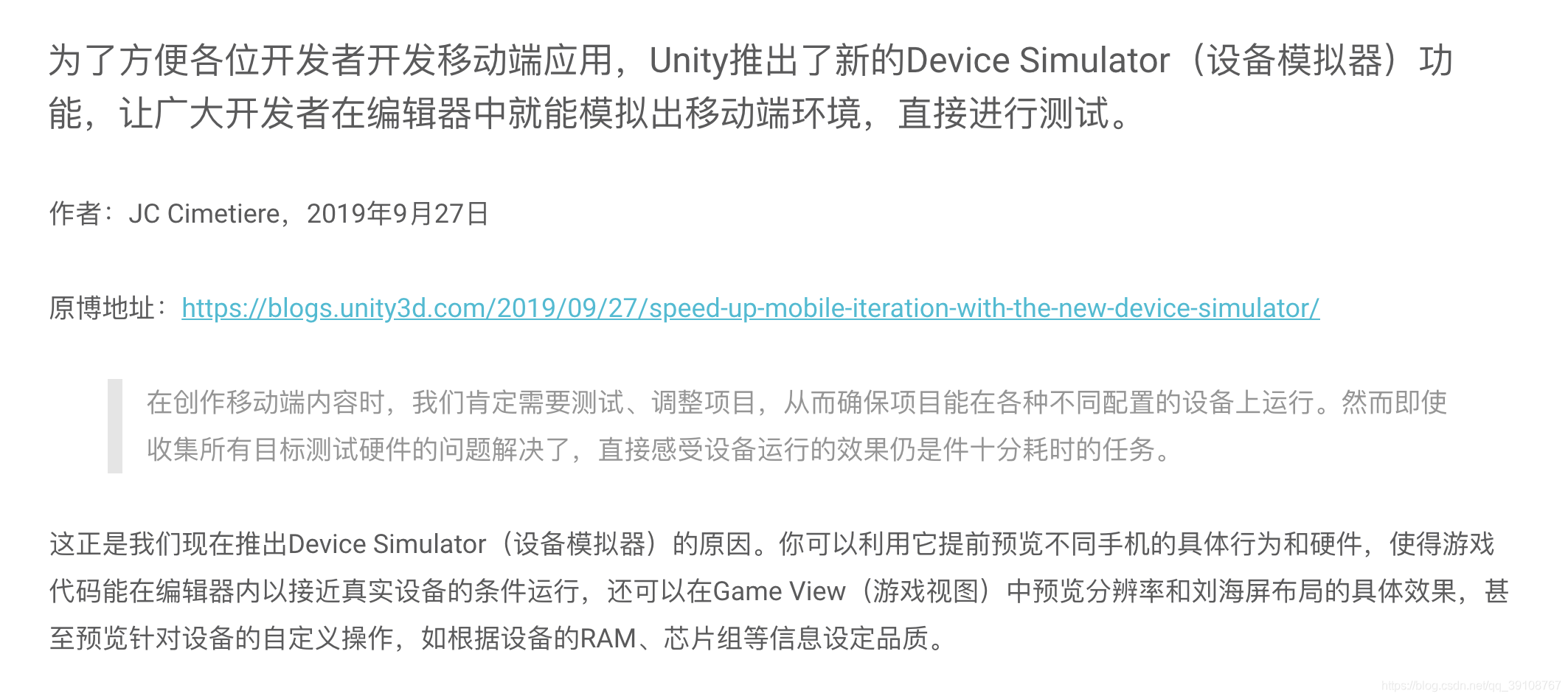 该功能在Unity 2019.3 (beta)及其后版本可用,预设大部分机型,也可以自定义机型, 可以模拟机型的分辨率和刘海屏,非常方便做UI适配(现在刘海屏、水滴屏、挖空屏··· 各种屏,适配起来超级麻烦,Device Simulator功能,无需打包到真机就能看适配,方便!)