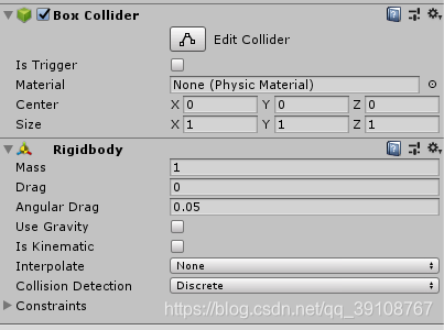 条件:至少有一个物体有Rigidbody刚体组件,两个物体都要有Collider碰撞器组件