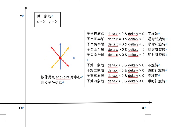 当拖拽时施加力的作用点在第一象限时,以施加力的作用点为坐标原点建立子坐标系,作用力的方向(子坐标系中所在的象限)与物体旋转方向如下图所示,其他象限同理: