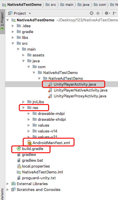 4. 接下来就是Android Studio的操作了,用AS打开Unity导出的项目,后续将在下图红色线框内标记的地方进行修改