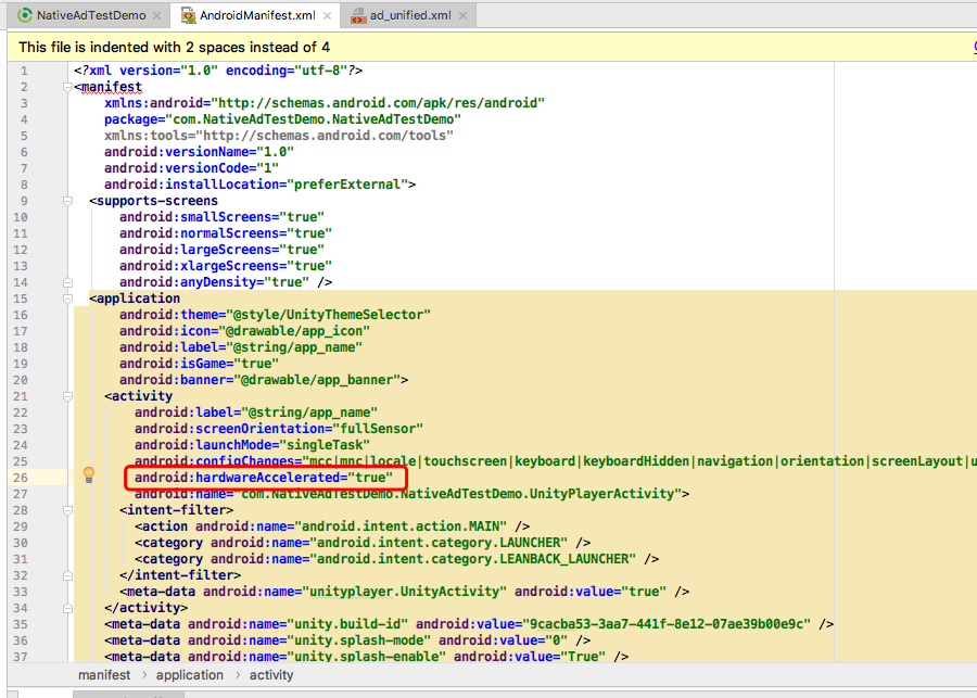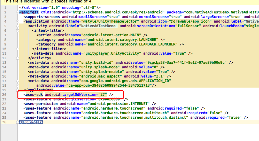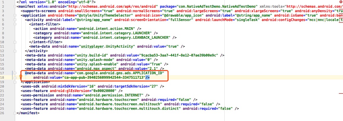 5.2 在"AndroidManifest.xml"文件中添加Admob的AppId,现在用的是测试Id,正式项目发布时需要换成正式Id