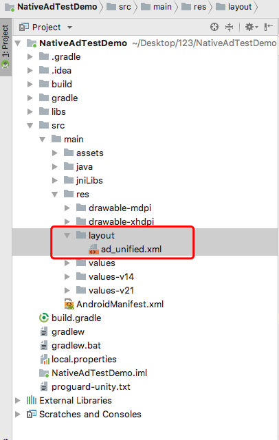 5.3 在"src\main\res"路径下创建"layout"文件夹,将官方Demo里相同路径的"ad_unified.xml" Android UI布局文件拖进来,可以尝试简单的修改一下相对位置、对齐方式等布局,如果对Android比较熟,也可以自己写布局文件,Demo布局文件如下: