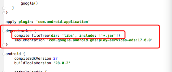 5.1 修改"build.gradle"文件,在下图标记位置添加代码,自动下载引用Android的Admob SDK
