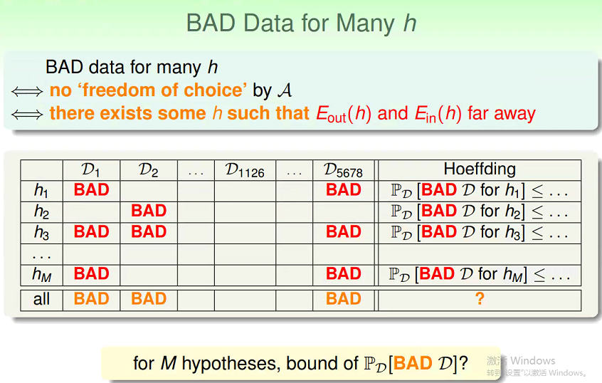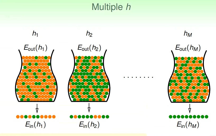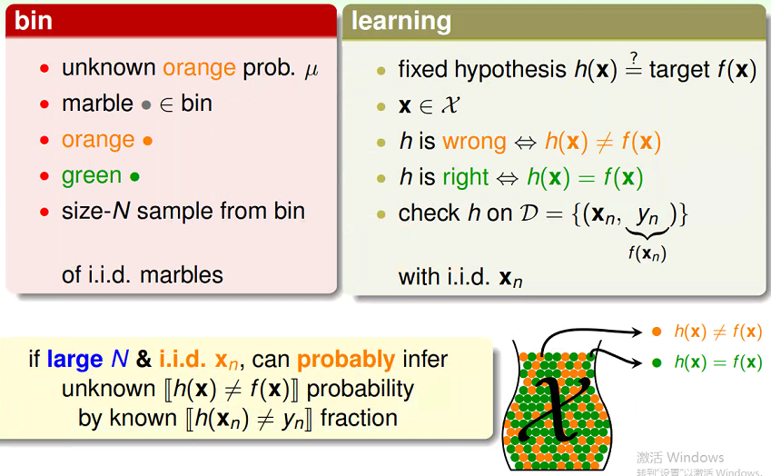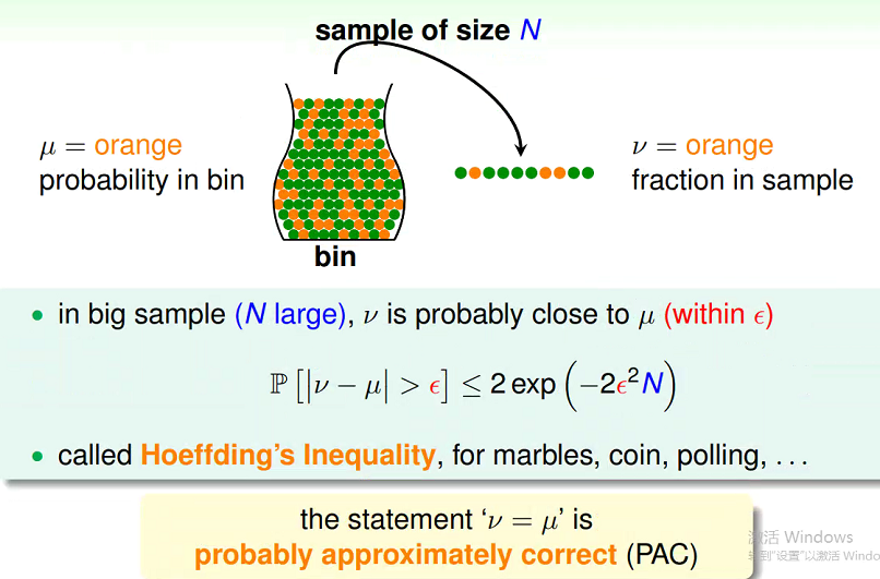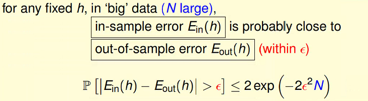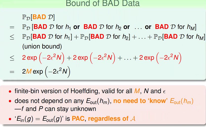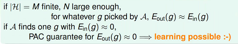 Hoeffding不等式,建立Ein和Eout的联系,证明对于某个h,当N足够大的时候,Ein和Eout是PAC的。最后,对于h个数很多的情况,只要有h个数M是有限的,且N足够大,就能保证Ein≈Eout,证明机器学习是可行的。