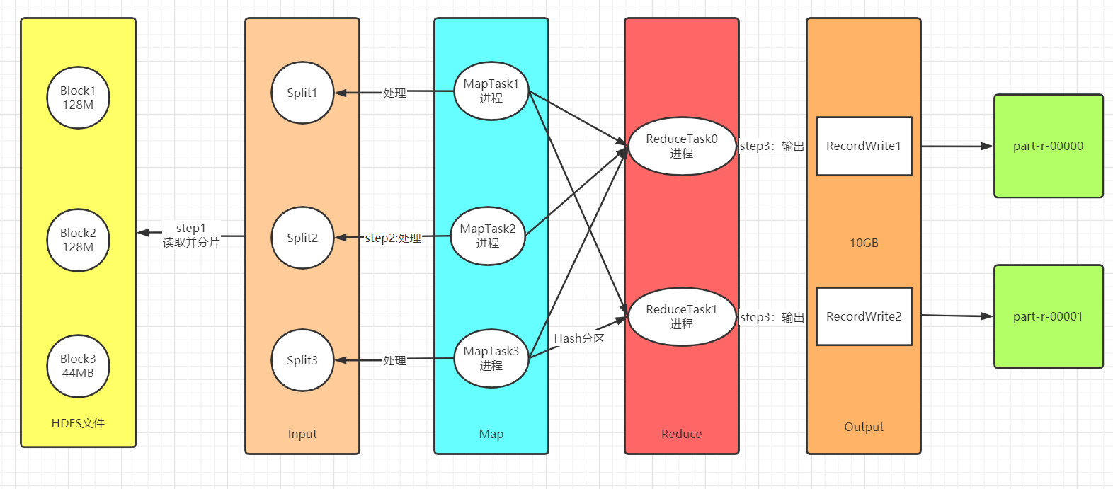 - 处理流程由代码中的函数决定,可以有多个Map和多个Reduce阶段