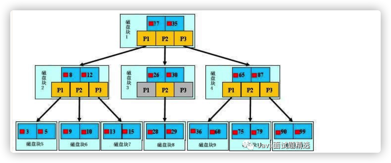真实的数据存在于叶子节点即3、5、9、10、13、15、28、29、36、60、75、79、90、99。非叶子节点只不存储真实的数据,只存储指引搜索方向的数据项,如17、35并不真实存在于数据表中。