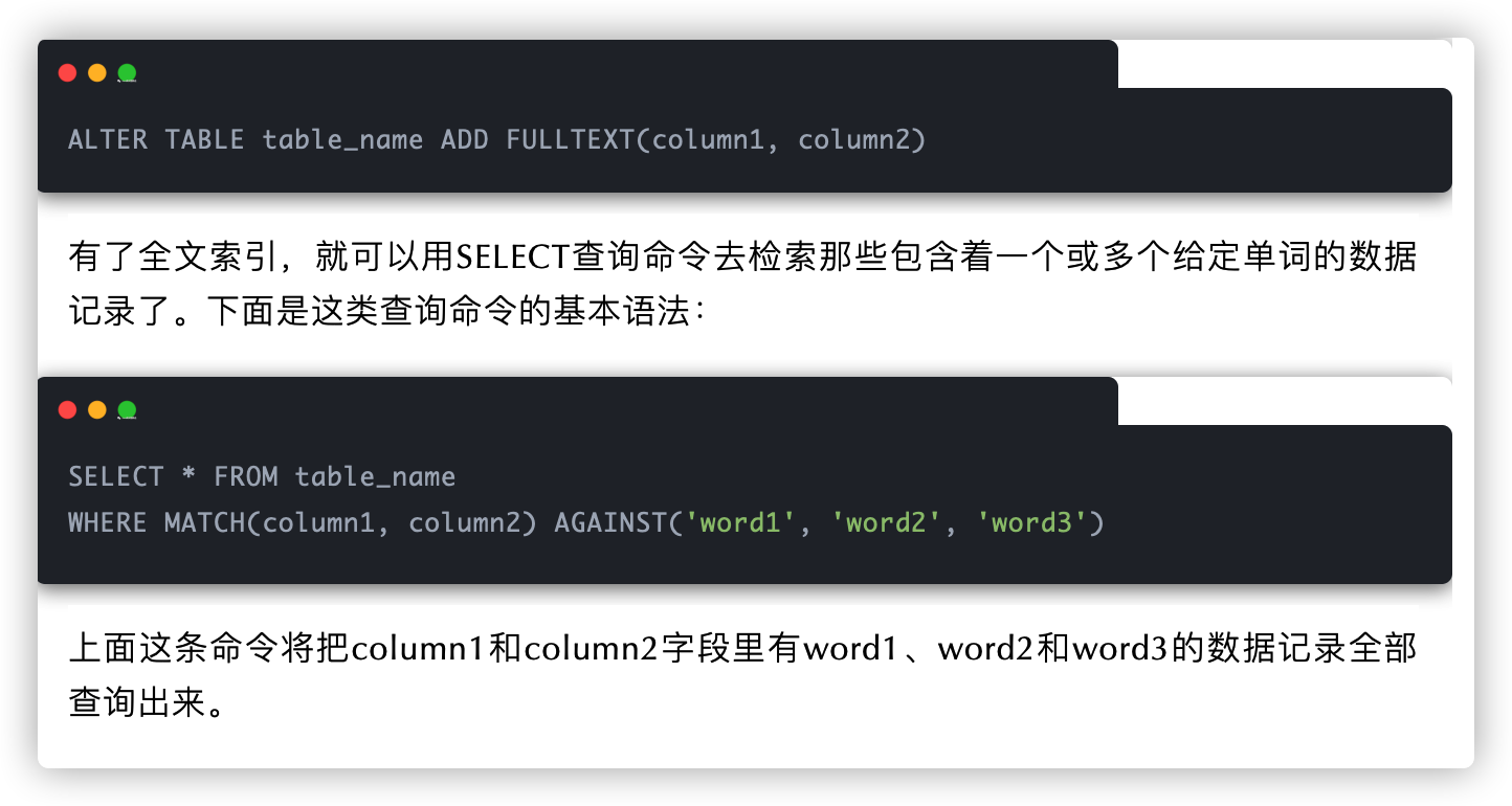 文本字段上的普通索引只能加快对出现在字段内容最前面的字符串(也就是字段内容开头的字符)进行检索操作。如果字段里存放的是由几个、甚至是多个单词构成的较大段文字,普通索引就没什么作用了。这种检索往往以LIKE %word%的形式出现,这对MySQL来说很复杂,如果需要处理的数据量很大,响应时间就会很长。