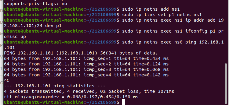 ovs-vsctl基础操作实践:创建OVS交换机,以ovs-xxxxxxxxx命名,其中xxxxxxxxx为本人学号。在创建的交换机上增加端口p0和p1,设置p0的端口号为100,p1的端口号为101,类型均为internal;为了避免网络接口上的地址和本机已有网络地址冲突,需要创建虚拟网络空间(参考命令netns)ns0和ns1,分别将p0和p1移入,并分别配置p0和p1端口的ip地址为190.168.1.100、192.168.1.101,子网掩码为255.255.255.0;最后测试p0和p1的连通性。