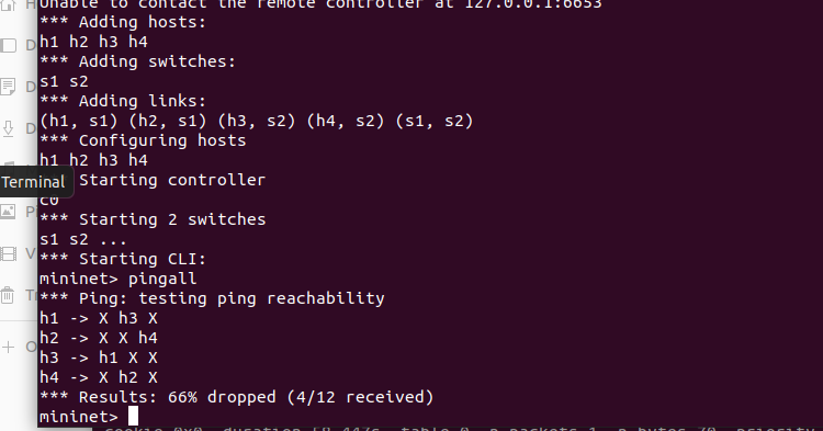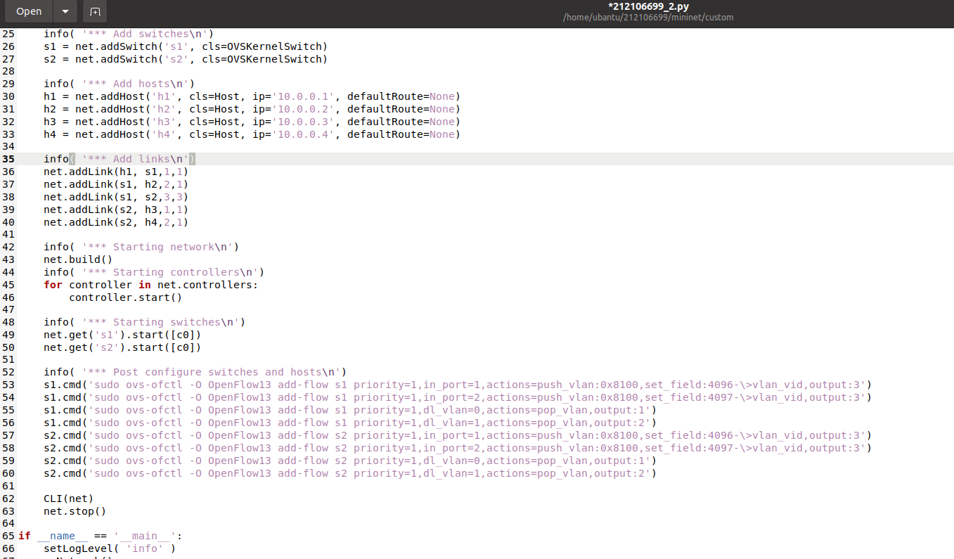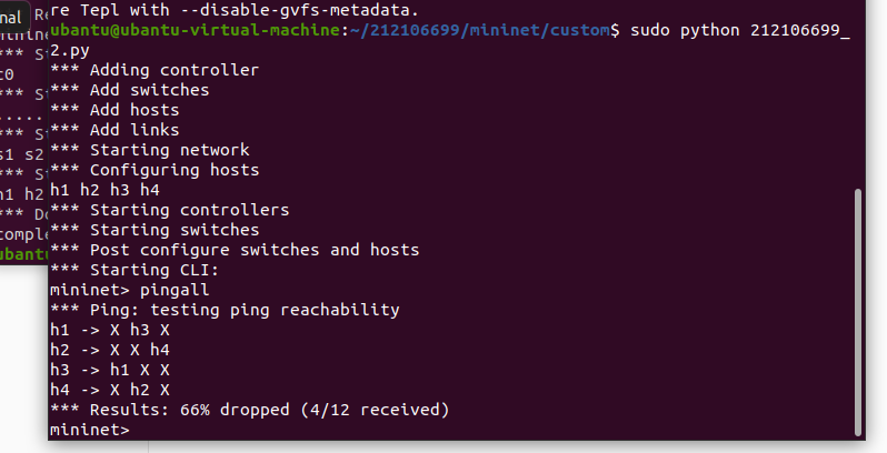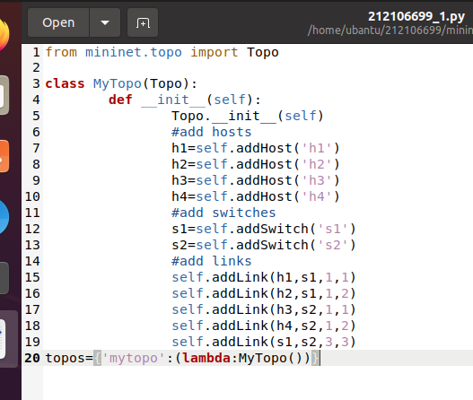 通过复制可视化界面搭建的拓扑后的代码,直接通过复制黏贴,然后改写python代码,形成新的拓扑,然后在sudo python 212106699_2.py命令运行