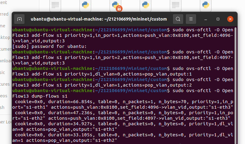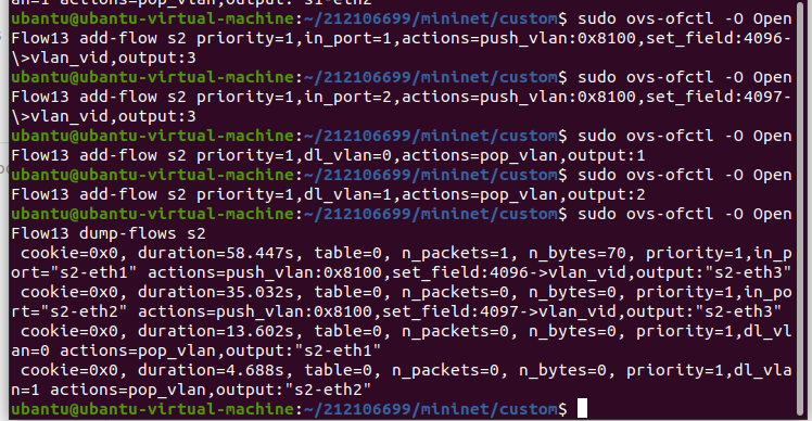 通过命令行终端输入“ovs-ofctl”命令,直接在s1和s2上添加流表,划分出所要求的VLAN。