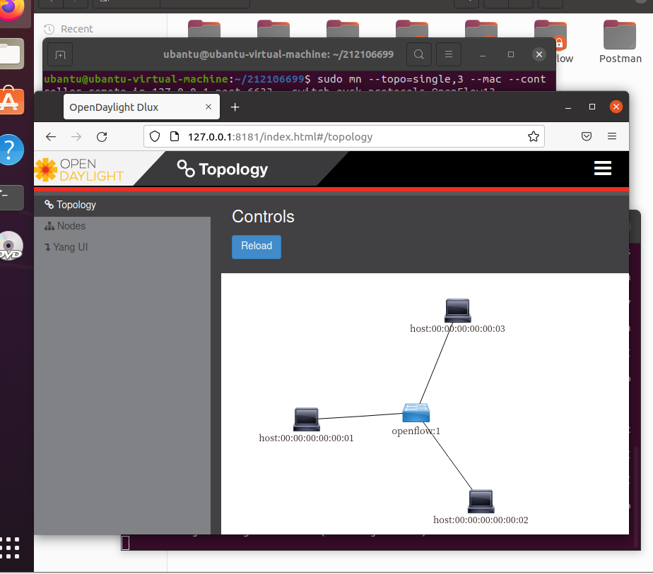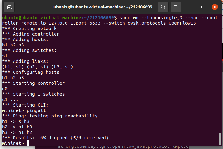 利用Mininet平台搭建下图所示网络拓扑,并连接OpenDaylight控制器;