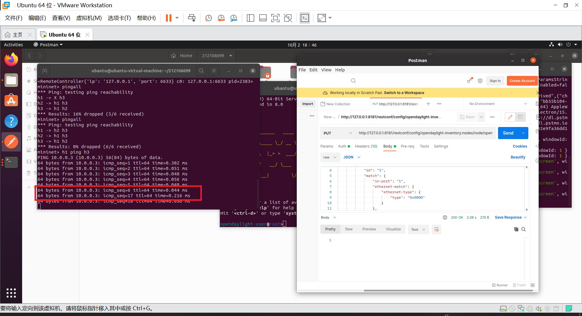 通过Postman工具调用OpenDaylight提供的API下发流表,实现拓扑内主机h1和h3网络中断10s。