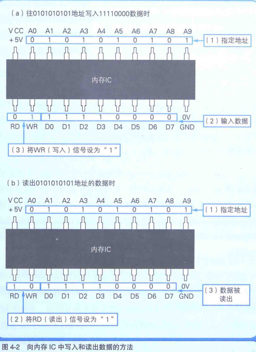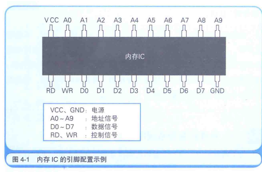 图4-1是内存IC(在这里假设它为RAM)的引脚配置示例。虽然这是一个虚拟的内存IC,但它的引脚和实际的内存IC是一样的。VCC和GND是电源,A0~A9是地址信号的引脚,D0~D7是数据信号的引脚,RD和WR是控制信号的引脚。将电源连接到VCC和GND后,就可以给其他引脚传递比如0或者1这样的信号。大多数情况下,+5V的直流电压表示1,0V表示0。
