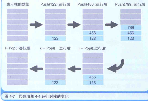 在栈中,LIFO 方式表示栈的数组中所保存的最后面的数据(Last In)会被最先读取出来(First Out)。代码清单4-4的程序运行后,按照123、456、789的顺序写入的数据,结果却按照789、456、123的顺序被读取出来(如下图):