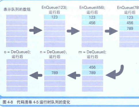 与栈相对的是队列,顾名思义,FIFO方式表示队列的数组中所保存的最初数据(First Input)会最先被读取出来(First Out)。代码清单4-5中的程序运行后,按照123、456、789的顺序写入的数据,结果会按照123、456、789的顺序被读取出来(如下图):
