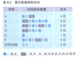 如表6-2所示,假设表示短点的位是1,表示长点的位是11的话,那么E(嘀)这一字符的数据就可以用1位的1来表示,C(嗒嘀嗒)这一字符的数据就可以用9位的110101101来表示。在实际的莫尔斯编码中,如果短点的长度是1长点的长度就是3,短点和长点的间隔就是1。