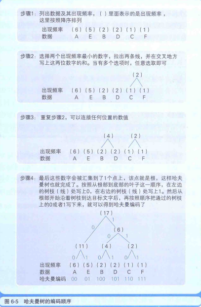 通过图 6-5 的步骤 2可以发现,在用枝条连接数据时,我们是从出现频率较低的数据开始的,这就意味着出现频率越低的数据到达根部的枝条数就越多。而枝条数越多,编码的位数也就随之增多了。