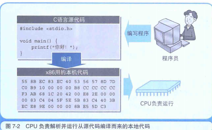 机器语言的程序称为本地代码(native code)。程序员用C语言等编写的程序,在编写阶段仅仅是文本文件。文本文件(排除文字编码的问题)在任何环境下都能显示和编辑。我们称之为源代码。通过对源代码进行编译,就可以得到本地代码。在市面上出售的用于Windows的应用软件包CD-ROM中,收录的就不是源代码,而是本地代码。(图7-2)。