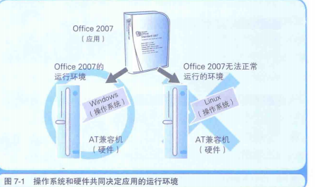 同一类型的硬件可以选择安装多种操作系统。例如,同样的AT兼容机 中,既可以安装Windows,也可以安装 Linux”等操作系统。正因为如此,Office 2007的运行环境中,把硬件和操作系统的种类这两方面内容都列了出来(图7-1)。