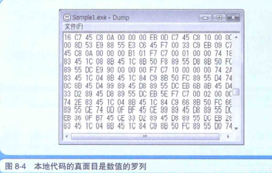 接下来,我们把刚才的 EXE 文件的内容 Dump 一下。Dump 是指把文件的内容,每个字节用2 位十六进制数来表示的方式。本地代码的内容就是各种数值的罗列,这一点想必大家都了解。而这些数值就是本地代码的真面目。每个数值都表示某一个命令或数据(图 8-4 )这里我们用的是原始的 Dump 程序。